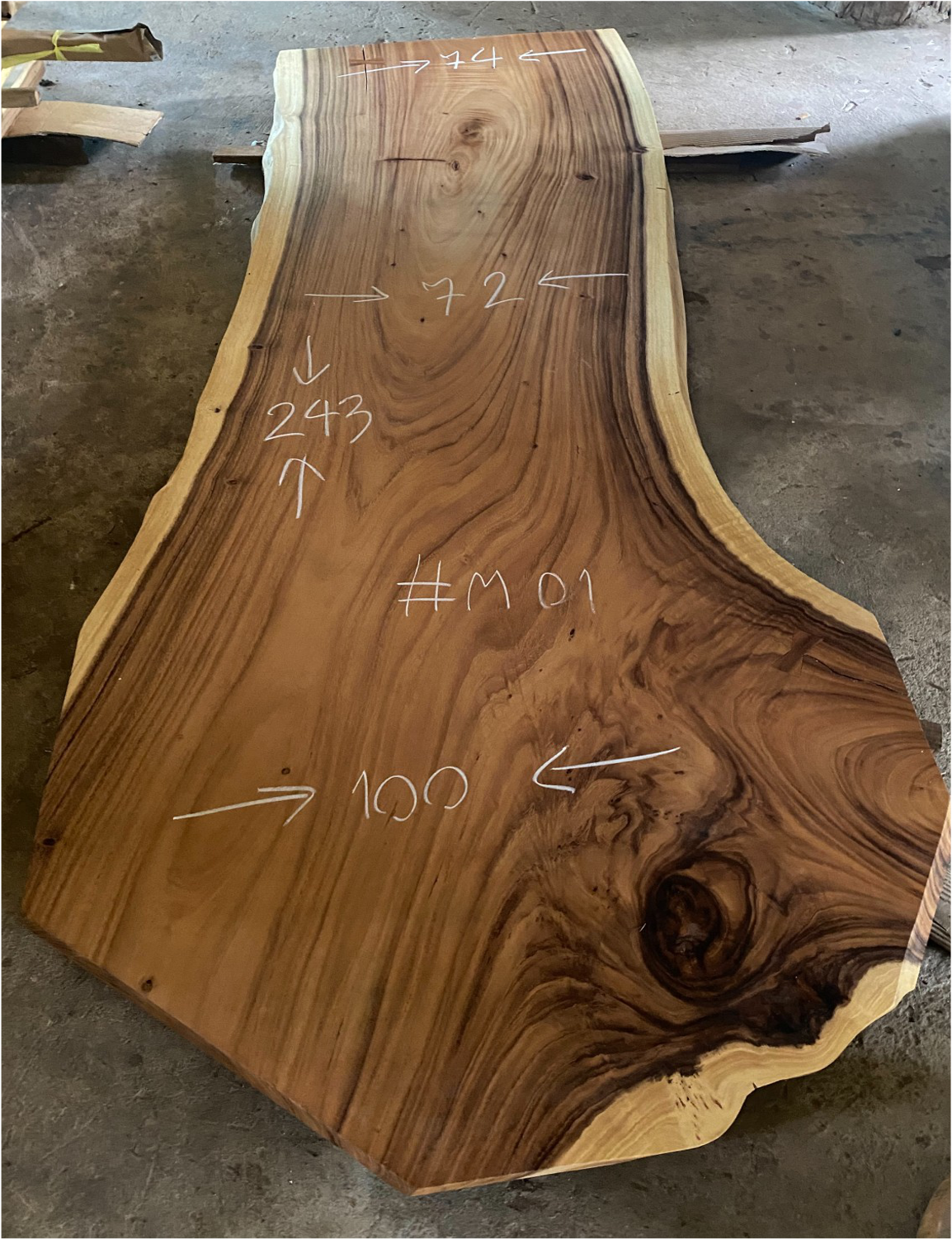 Saman ou "Arbre à pluie", ce grand arbre à la particularité de pousser très rapidement et ainsi d'être récolté et remplacé par de nouveaux. Pour cette raison, de nombreuses plantations de suar ont vu le jour en Asie et en particulier en Thailande d'où proviennent nos slabs. C'est aussi pour ses diverses qualités, son grain fin, ses traits de croissance et ses beaux dégradés qu'il se prête magnifiquement au travail de plateaux de table live Edge.