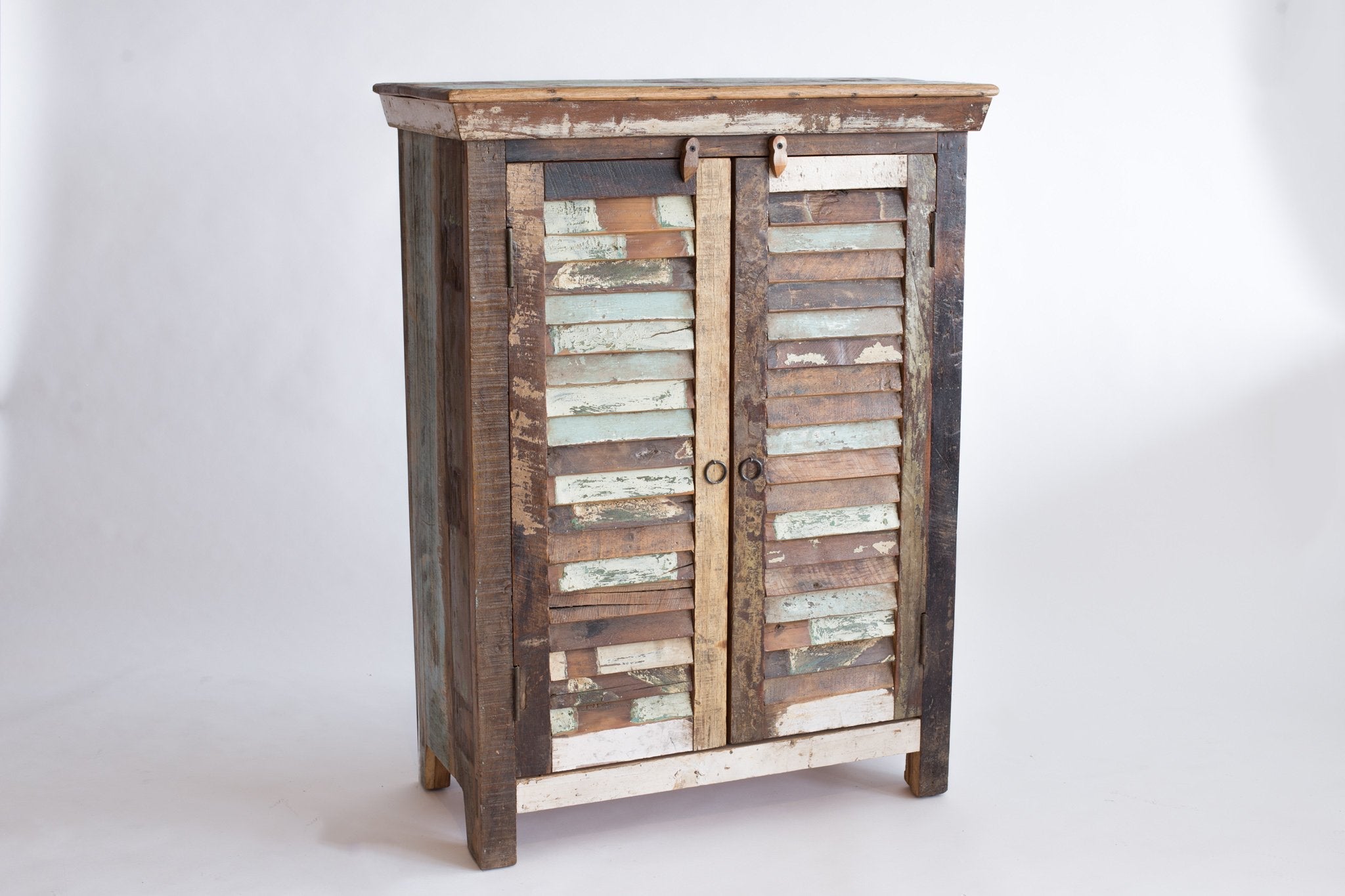 Ce cabinet avec deux portes et trois tablettes en bois recyclé offre un grand espace de rangement tout en apportant une touche rustique et écologique à votre intérieur. Chaque pièce est unique grâce aux variations de couleurs naturelles du bois.