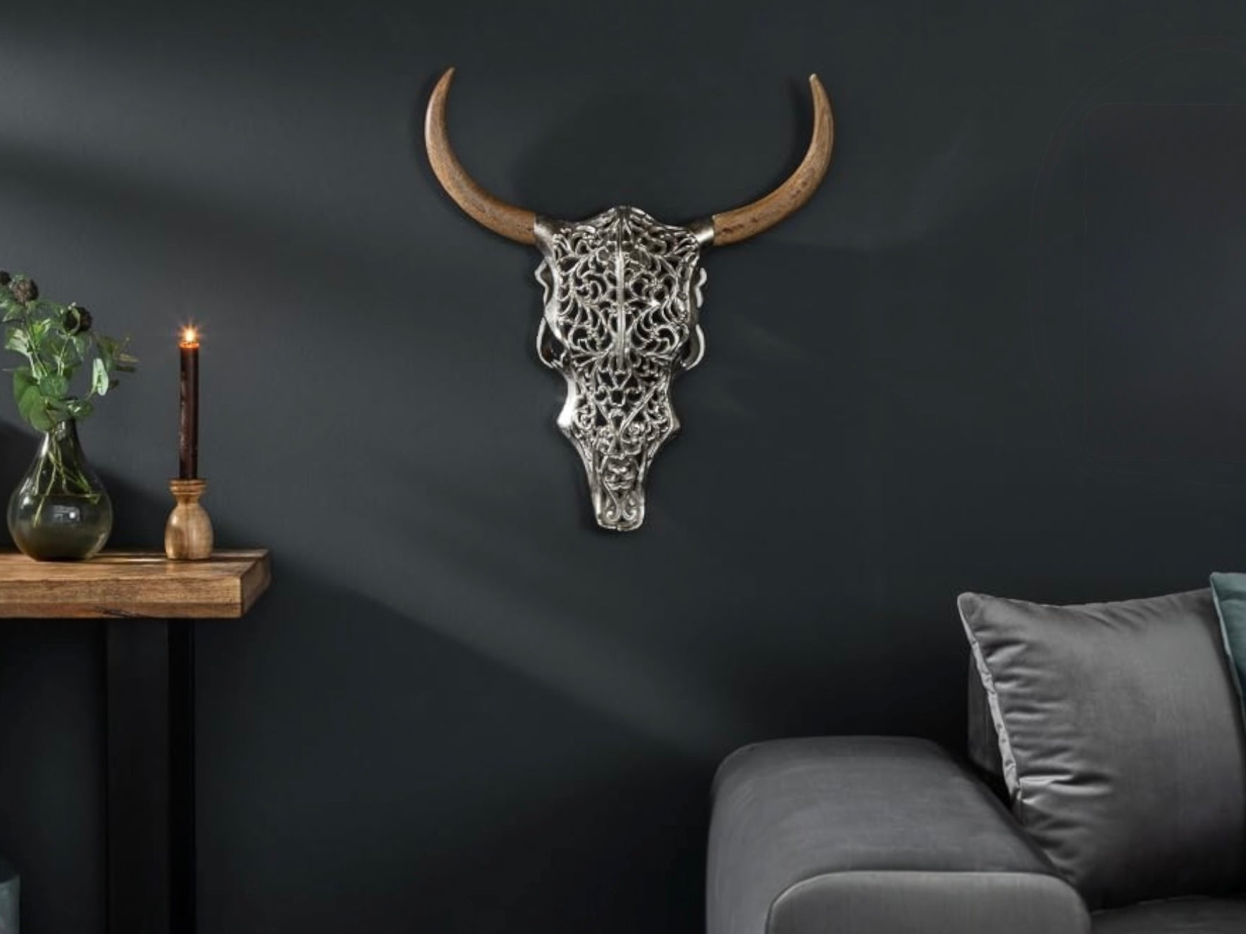 Apportez une touche d’audace et d’élégance à votre intérieur avec ce crâne de vache en acier argenté sculpté, sublimé par de véritables cornes en bois. Véritable œuvre d’art, cette pièce unique associe la brillance du métal travaillé aux nuances naturelles du bois, créant un contraste fascinant entre design moderne et esprit authentique.