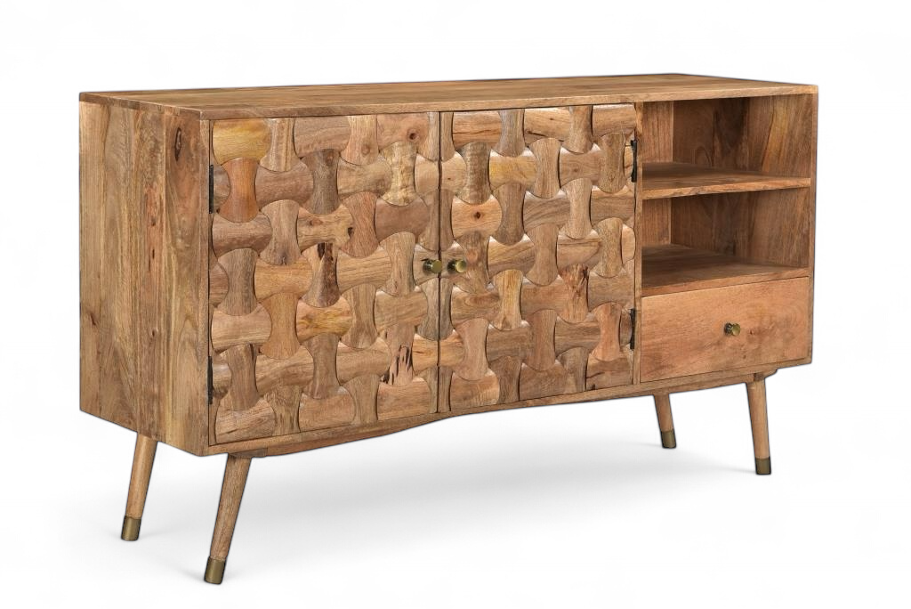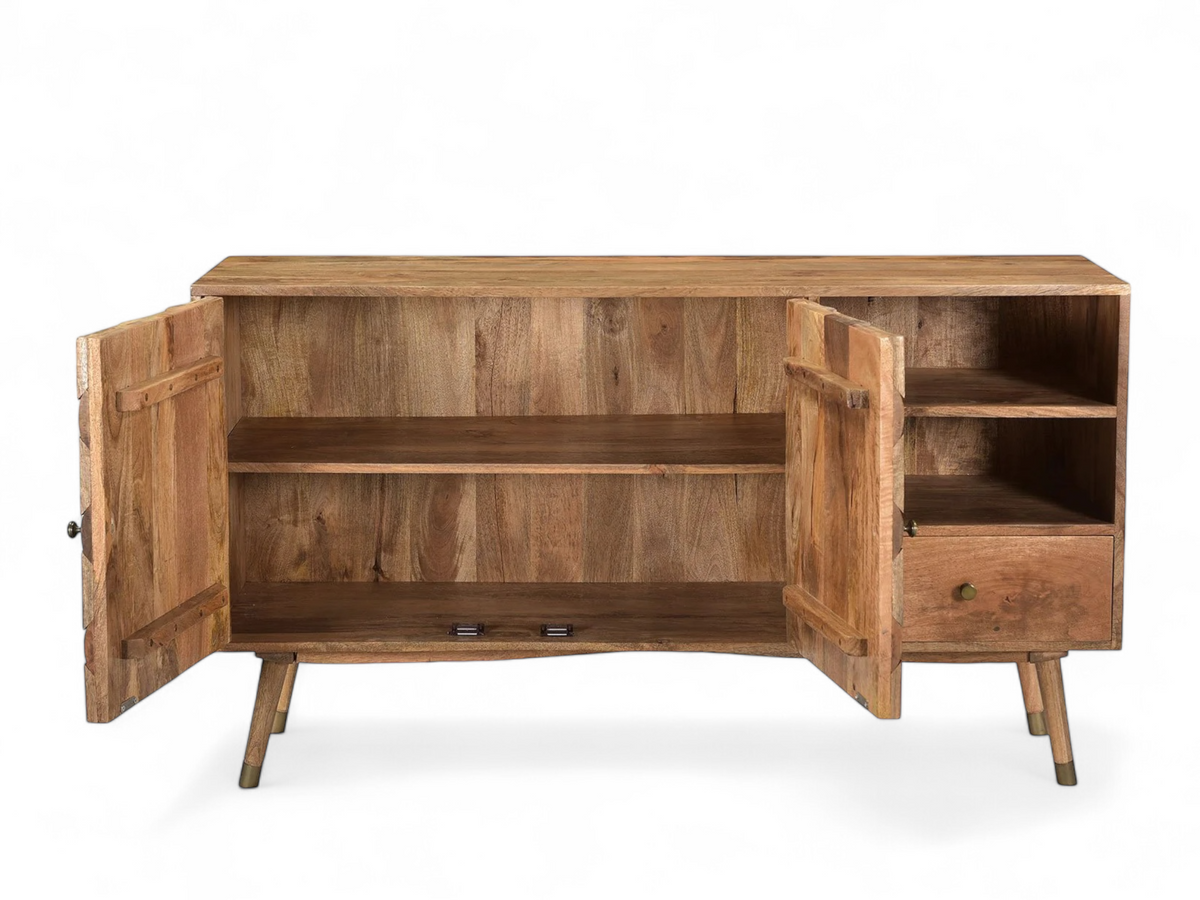 Le buffet Sajara à deux portes est le choix parfait pour allier style, praticité et durabilité. Il s’intègre harmonieusement à tous types d’intérieurs tout en offrant un espace de rangement optimal, avec ses deux portes et son tiroir.