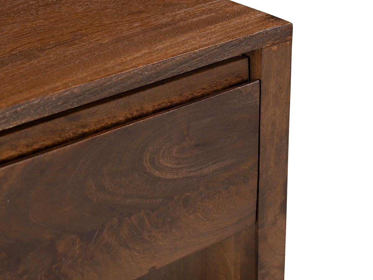 Cette table de nuit en bois de manguier massif, teintée brun, met en valeur le veinage naturel du bois. Dotée d’un tiroir spacieux et d’une étagère ouverte, elle est idéale pour garder vos essentiels de nuit bien organisés et à portée de main.