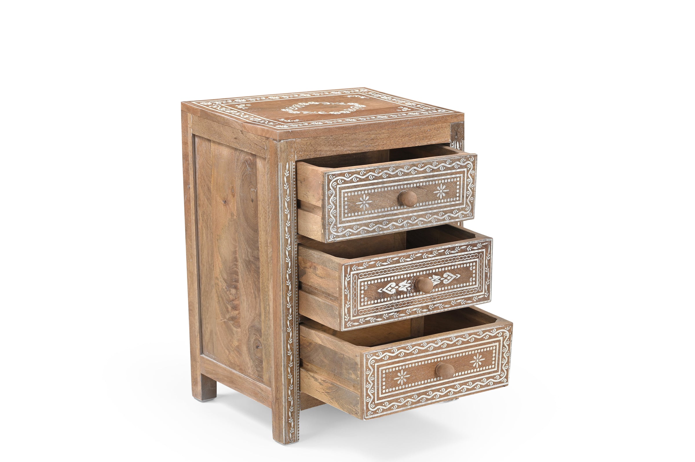 Cette table de nuit en bois de manguier blanchi apporte une touche naturelle à votre chambre. Dotée de trois tiroirs spacieux, elle est idéale pour garder vos essentiels de nuit bien organisés et à portée de main.