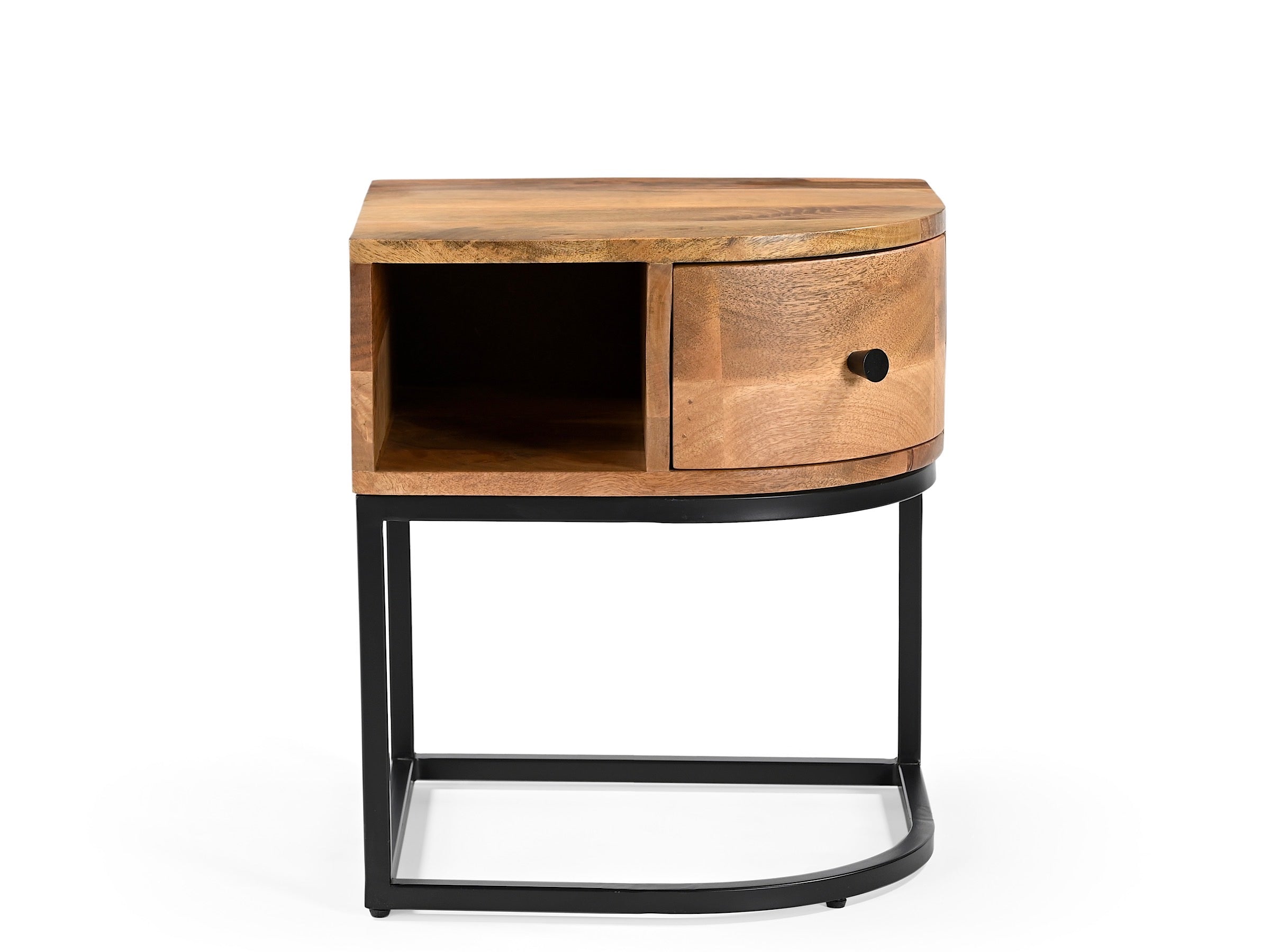 Optimisez l’espace de votre chambre avec cette table de nuit d’angle en bois de manguier massif. Conçue pour s’intégrer parfaitement dans un coin, elle dispose d’un tiroir pratique pour vos essentiels et d’une niche ouverte idéale pour déposer livres, réveil ou objets déco.