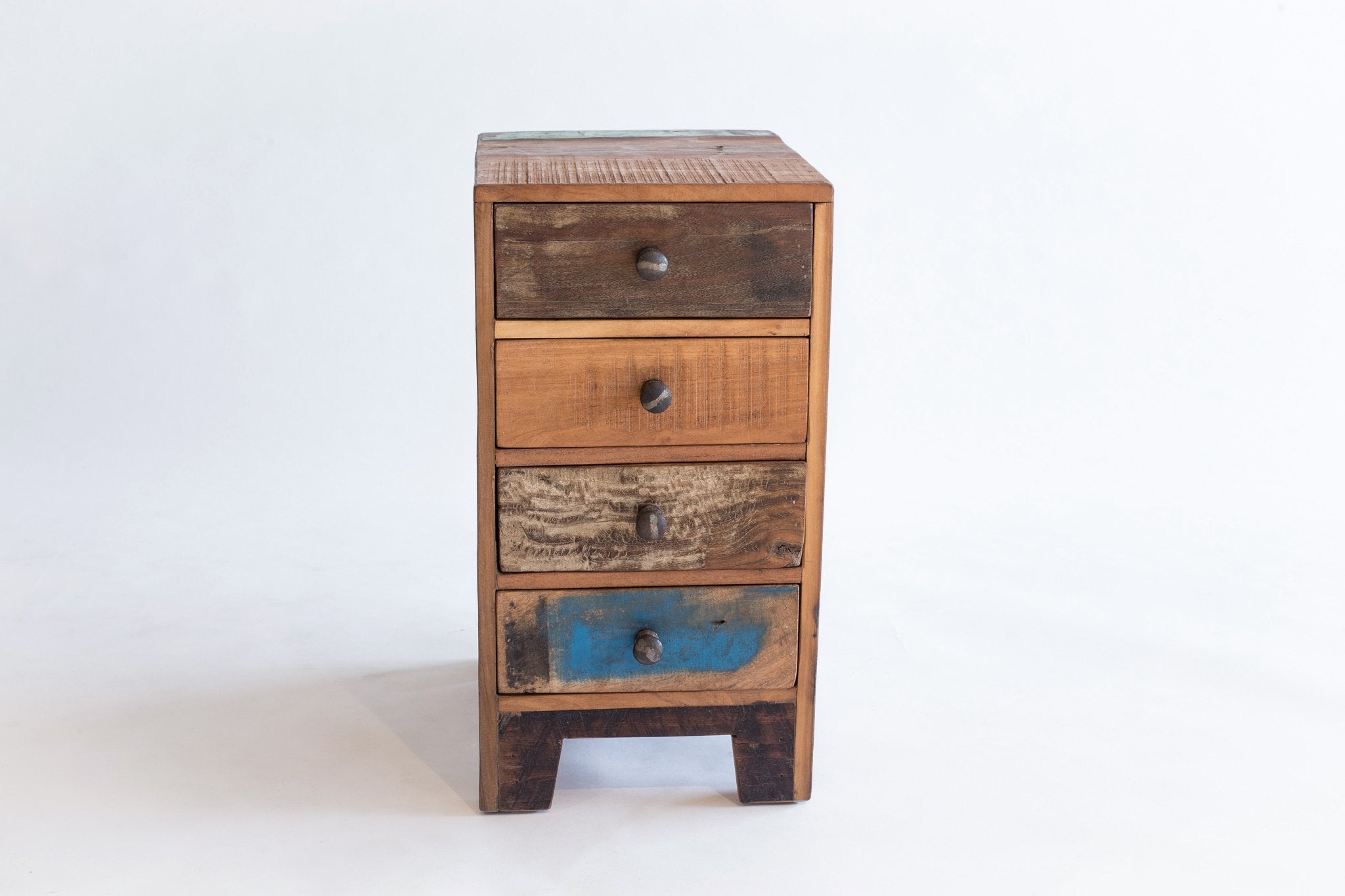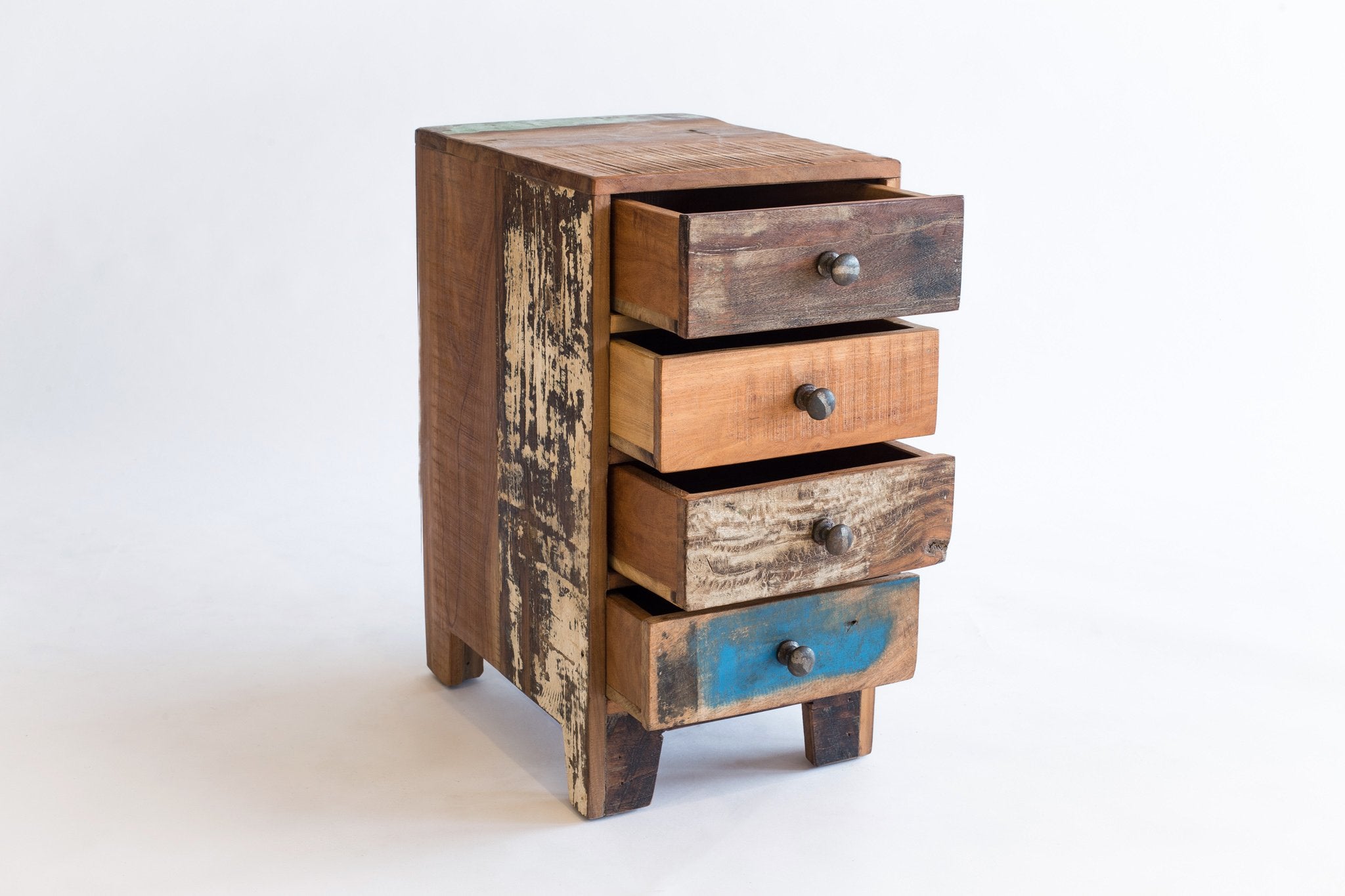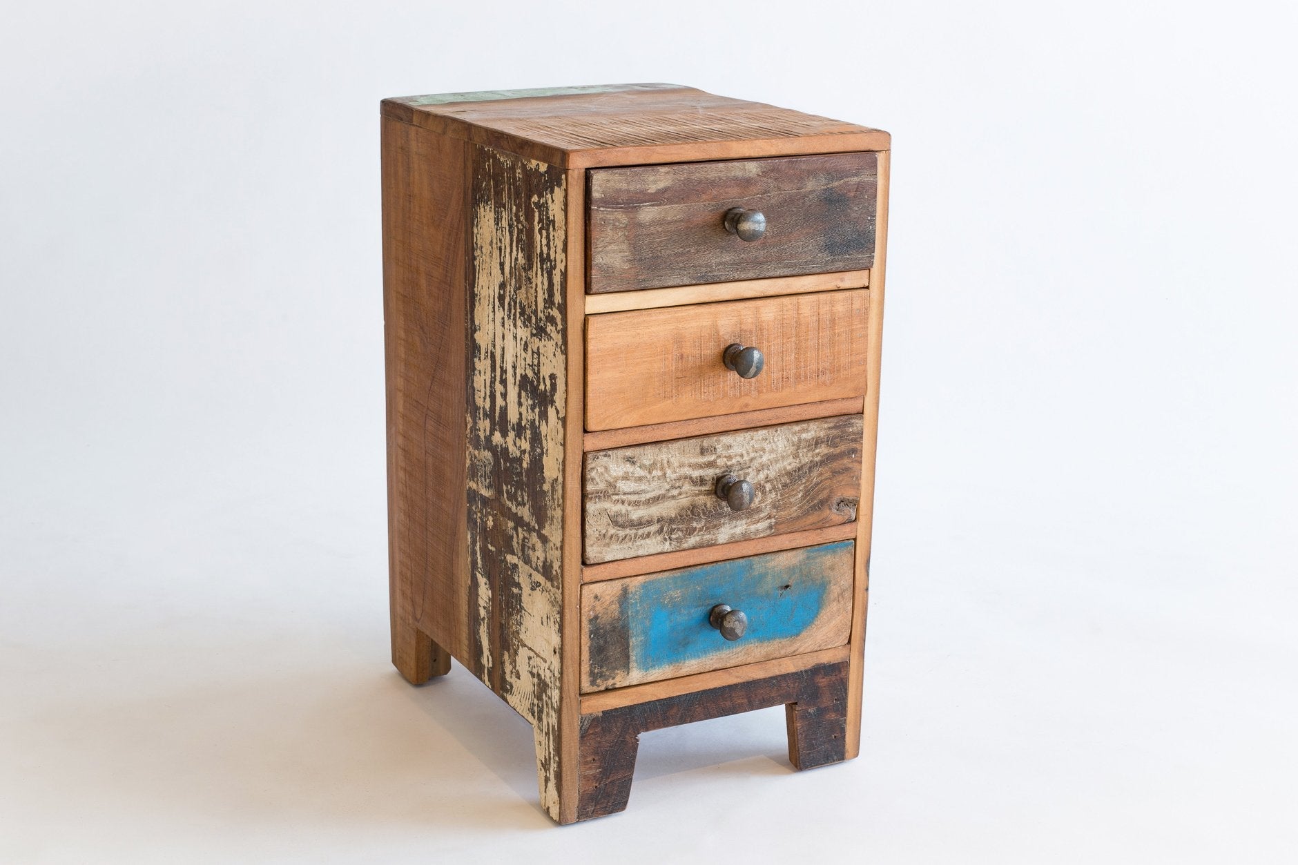 Ajoutez une touche de charme rustique à votre chambre avec cette table de chevet en bois recyclé. Ses quatre tiroirs offrent un espace de rangement pratique tout en apportant une esthétique chaleureuse et écoresponsable.