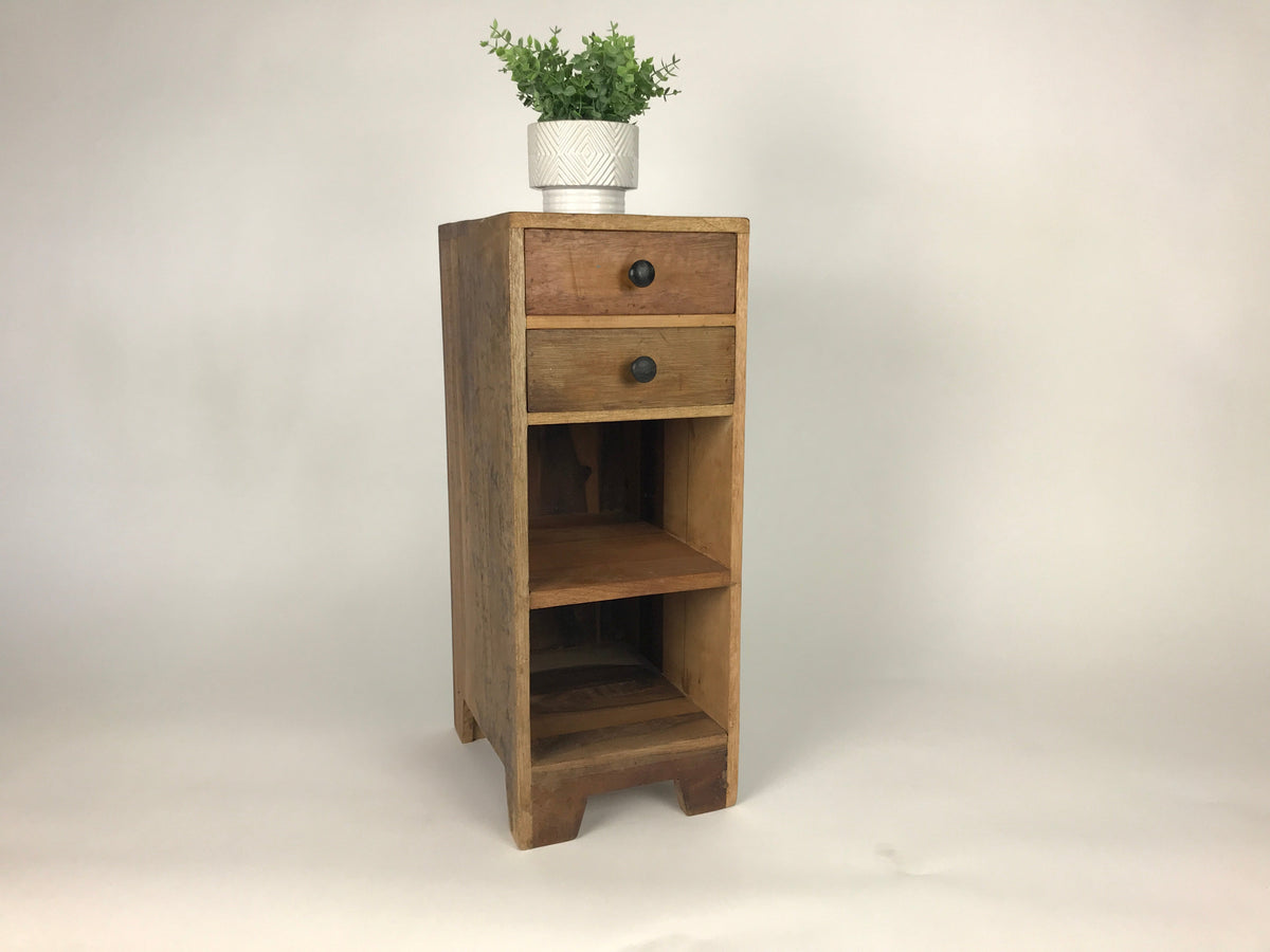 Cette table de chevet Fitay, fabriquée en bois recyclé, est équipée de deux tiroirs et deux tablettes, offrant un espace de rangement pratique et écologique. Son design rustique s'adapte parfaitement à n'importe quel décor de chambre.