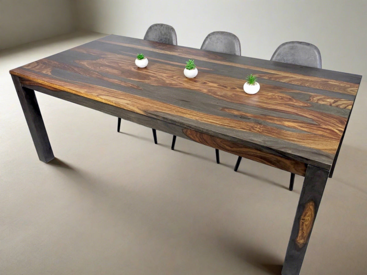 Cette table à dîner en bois de rose ajoute une touche d'élégance naturelle à votre salle à manger. Son design épuré est parfait pour les repas en famille ou entre amis. Disponible en trois couleurs : naturel, brun et olive, elle s'intègre facilement à toute décoration intérieure.