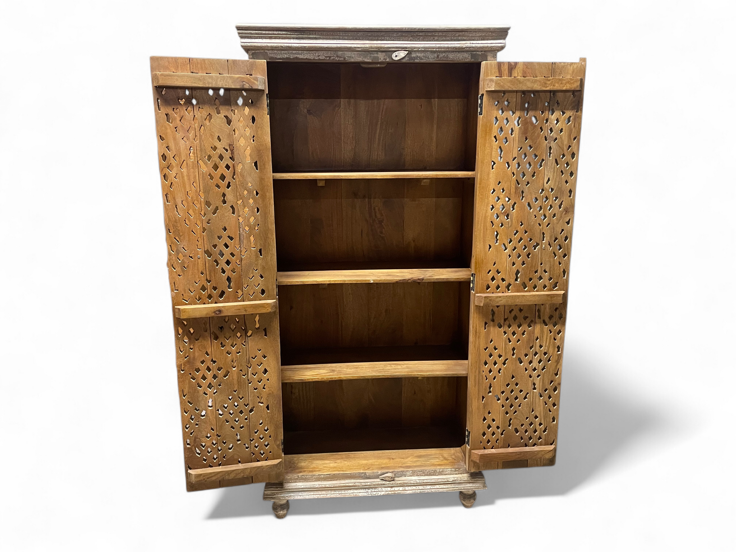 Armoire en bois sculpté à la main, parfaite comme pièce maîtresse dans votre décor. Son style artisanal et ses détails raffinés ajoutent du caractère et de la chaleur à tout intérieur. Disponible en deux finis : blanc ou marron.
