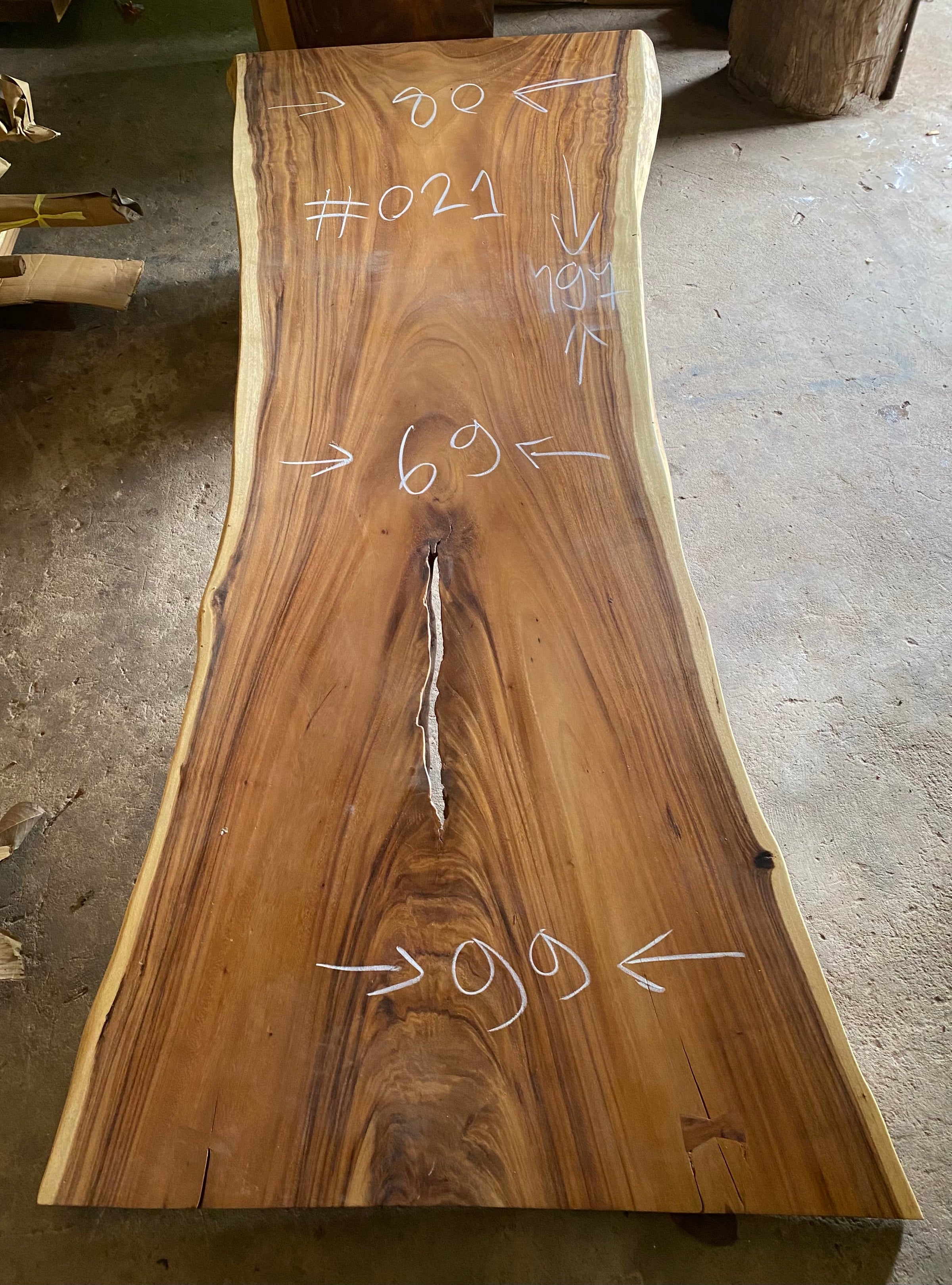 Saman ou "Arbre à pluie", ce grand arbre à la particularité de pousser très rapidement et ainsi d'être récolté et remplacé par de nouveaux. Pour cette raison, de nombreuses plantations de suar ont vu le jour en Asie et en particulier en Thailande d'où proviennent nos slabs. C'est aussi pour ses diverses qualités, son grain fin, ses traits de croissance et ses beaux dégradés qu'il se prête magnifiquement au travail de plateaux de table live Edge.