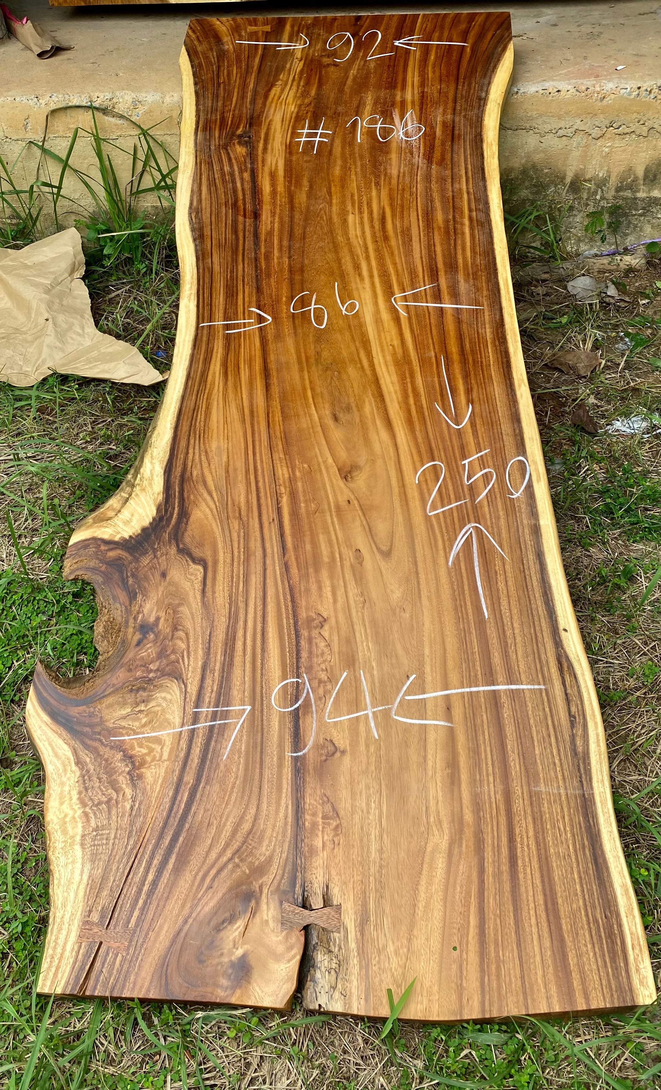 Saman ou "Arbre à pluie", ce grand arbre à la particularité de pousser très rapidement et ainsi d'être récolté et remplacé par de nouveaux. Pour cette raison, de nombreuses plantations de suar ont vu le jour en Asie et en particulier en Thailande d'où proviennent nos slabs. C'est aussi pour ses diverses qualités, son grain fin, ses traits de croissance et ses beaux dégradés qu'il se prête magnifiquement au travail de plateaux de table live Edge.