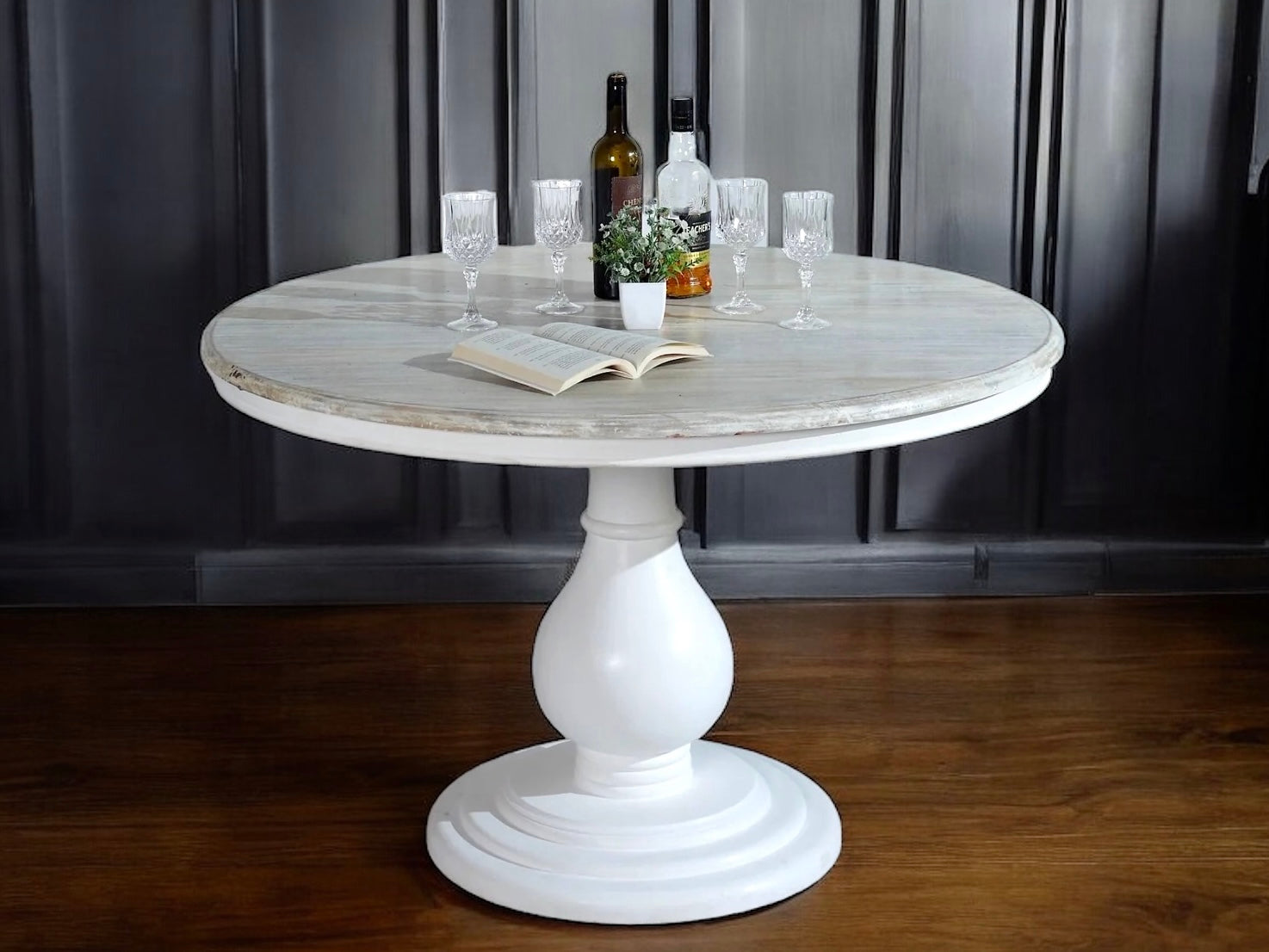 Cette table allie le charme naturel du bois de manguier à une finition blanche rustique. Son design rond offre une convivialité sans pareille, idéal pour des dîners entre amis ou des réunions de famille. Son pied issu du tournage de bois offre une originalité et une robustesse.