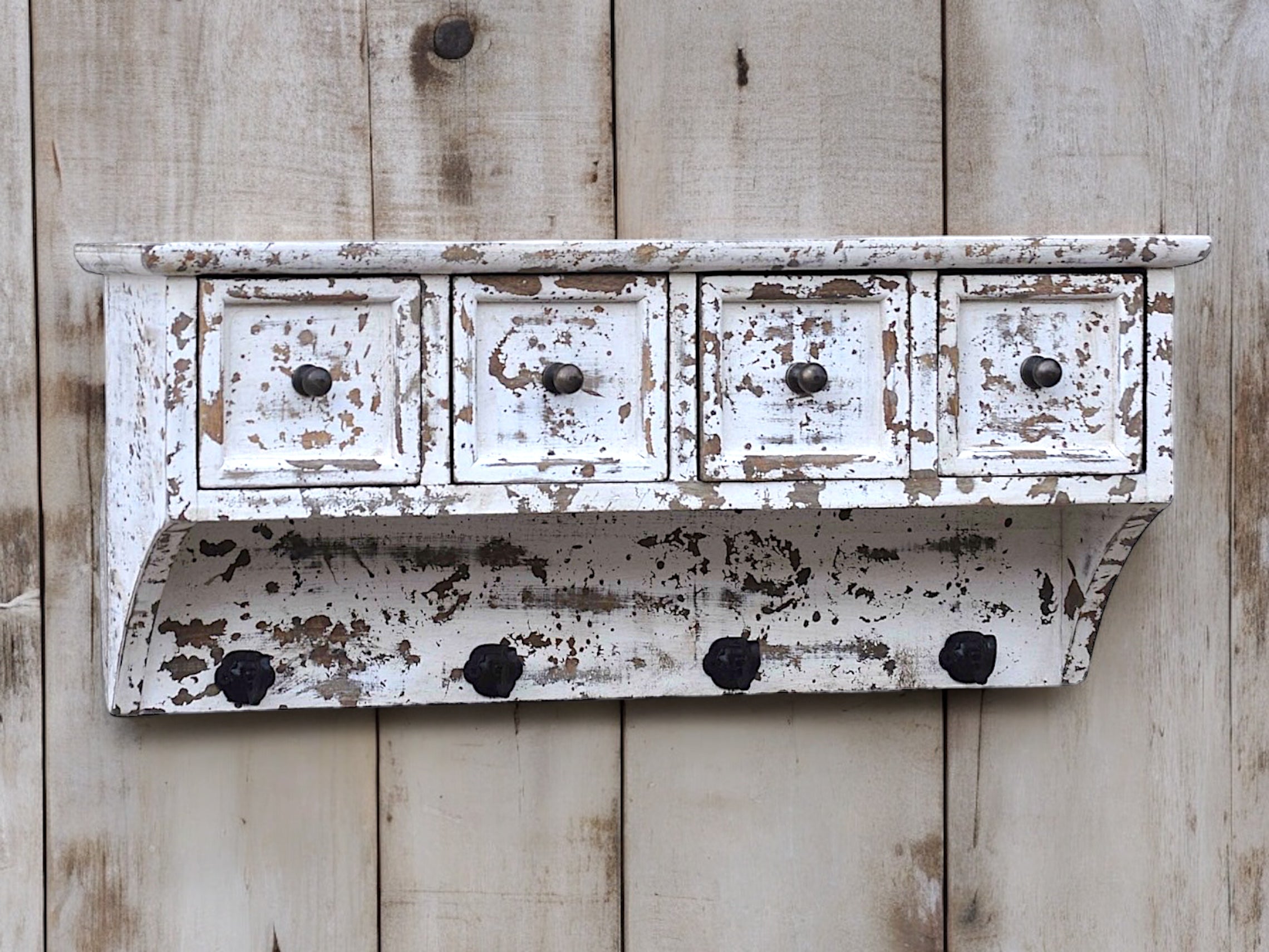 Parfaite pour une entrée, cette patère murale est dotée de quatre petits tiroirs pour ranger vos objets et de crochets pour suspendre vos clés et accessoires. Elle combine fonctionnalité et style élégant.