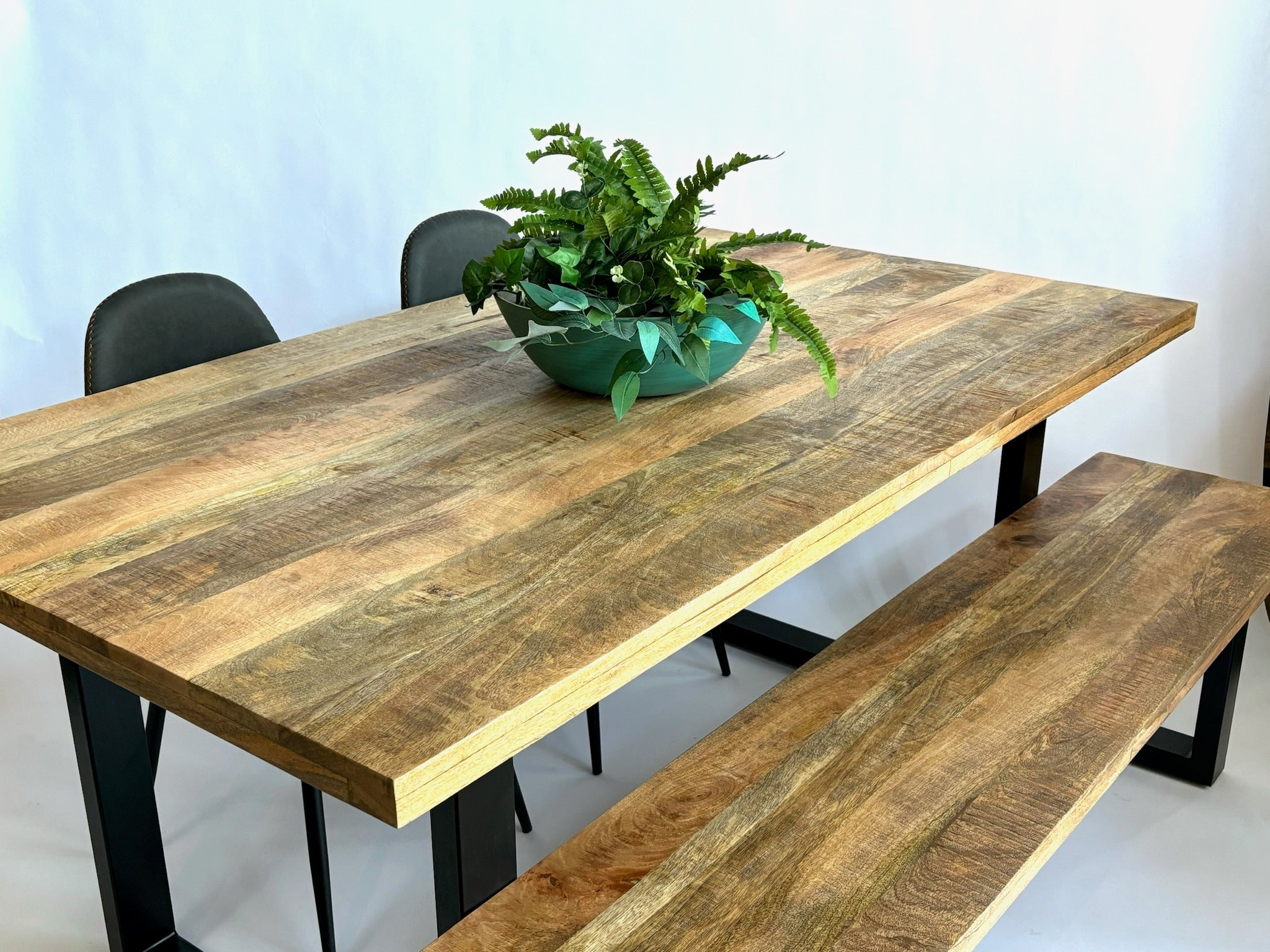 Incarnation de la simplicité moderne, le Banc Sagar offre une assise raffinée et durable avec son bois de manguier laminé et ses pattes en métal formant un 'U' stylisé.