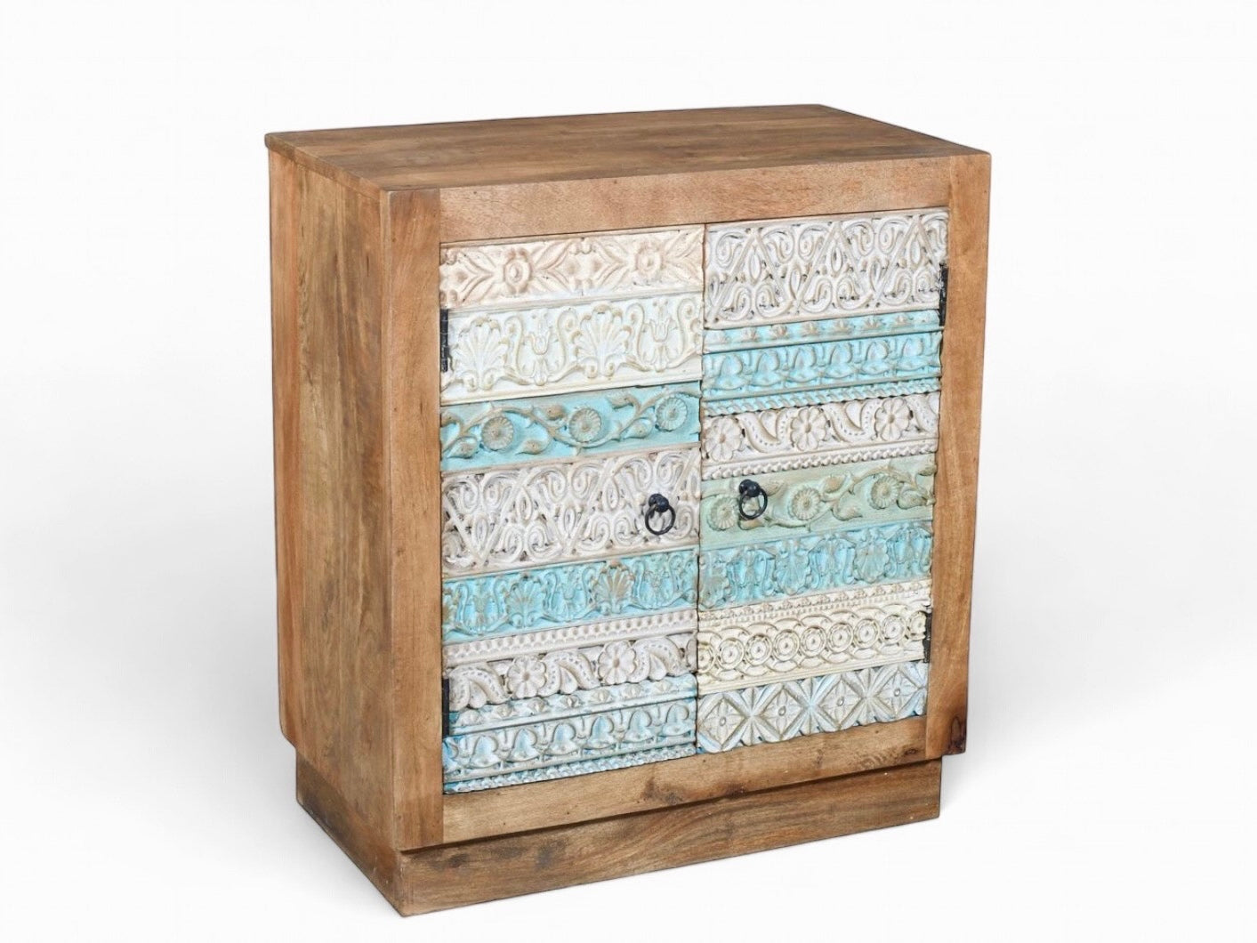 Le buffet 2 portes Sylvana en bois de manguier ajoute une touche artistique et élégante à votre intérieur. Ce meuble dispose de portes sculptées colorées et d'une étagère intérieure, parfait pour ranger et exposer vos objets préférés.