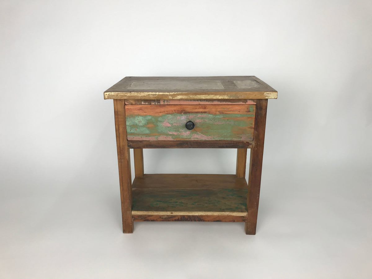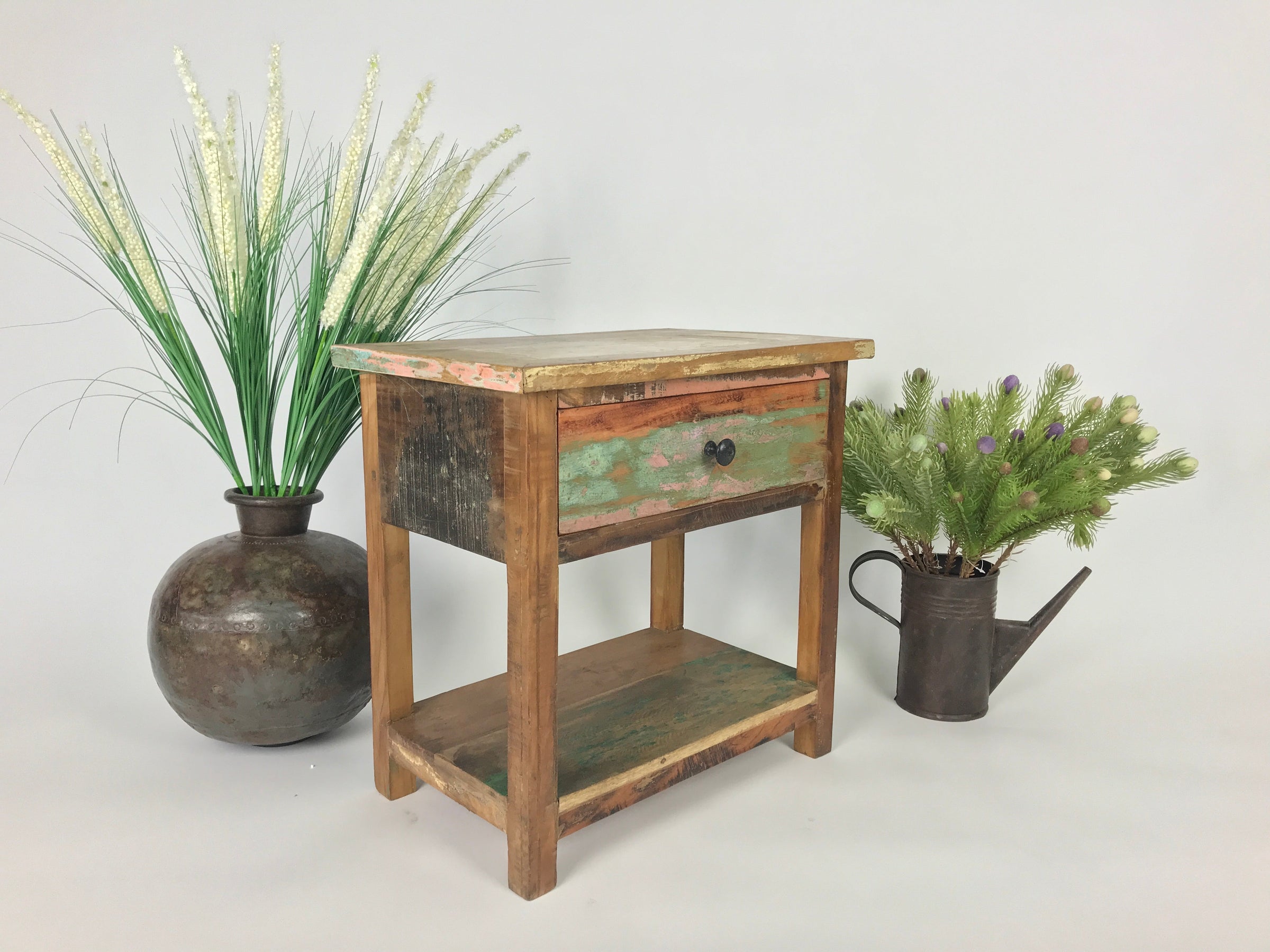 Cette table de chevet en bois exotique recyclé est parfaite pour une touche naturelle et fonctionnelle dans votre chambre. Avec un tiroir spacieux, elle offre un rangement pratique tout en étant respectueuse de l'environnement.